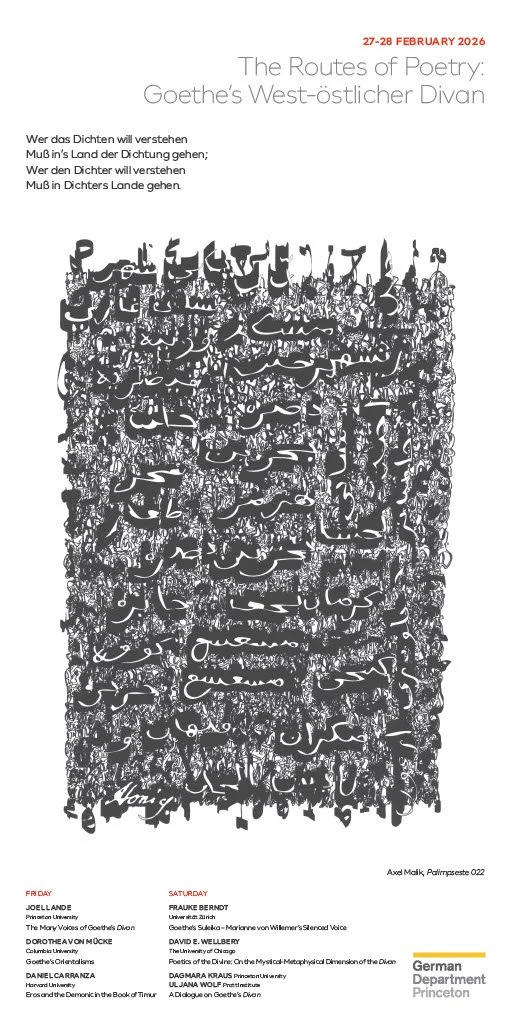 Feb. 27-28, 2026: “Eros and the Daimonic in the Book of Timur.” For a workshop on Goethe’s West-Eastern Divan. Princeton University. Princeton, NJ. Presenter & discussion facilitator.